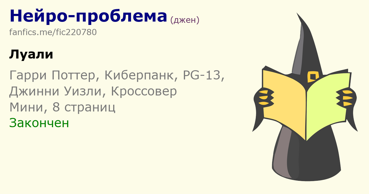 | #фидбэк_Лиги_фанфикса В этой истории автор прямо погружает читателя в мир, нарисованный на арте, а не придумывает свою интерпретацию картинки. Это проявление уважения к посылу артера. Классическая история одержимости Джинни Уизли душой Тома Риддла превращается в результат грамотной хакерской атаки. Нюансы канона второй книги ГП органично вплетаются в киберпанковское будущее. Очень яркая картинка мира будущего с извечными проблемами старого. Что ж, наверное, в этом мире Том всё-таки обретёт вожделенное бессмертие, пусть и в цифровой форме. Иронично, но он мог бы достичь его и в каноне, не становясь садюгой-террористом. Просто шагнуть в ХХI век и сделать ставку на магловские технологии. Учитывая продолжительность жизни магов, вполне реально. Интересно, а что было бы, если Джинни удалось бы взломать чип АПВБД? 4 | |