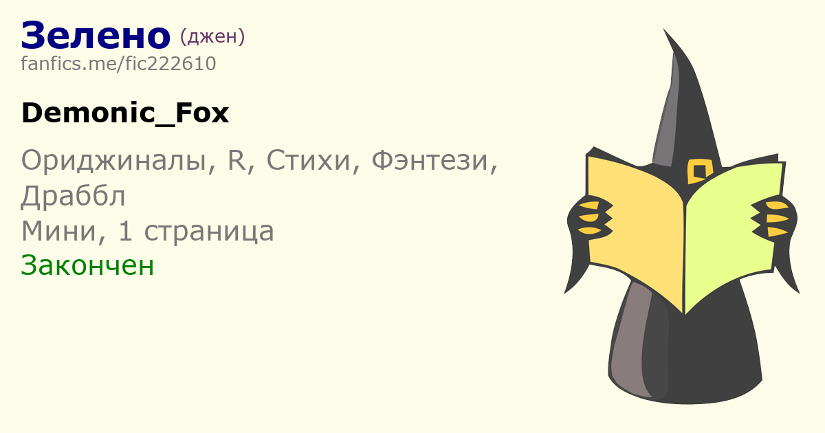 <a href="https://fanfics-kl.ru/fic222610"><b>Зелено</b></a> (джен)<br>Автор: <a href="https://fanfics-kl.ru/user952142">Demonic_Fox</a><br>Фандом: <a href="https://fanfics-kl.ru/fandom1">Ориджиналы</a><br>Рейтинг: R<br>Жанр: Стихи, Фэнтези, Драббл<br>Размер: Мини | 539 знаков<br>Статус: Закончен<br>Предупреждения: От первого лица (POV), Насилие<br>Саммари:<br>Зелёным мячом убили меня,<br /> <br />Зелёный свет объял рога.